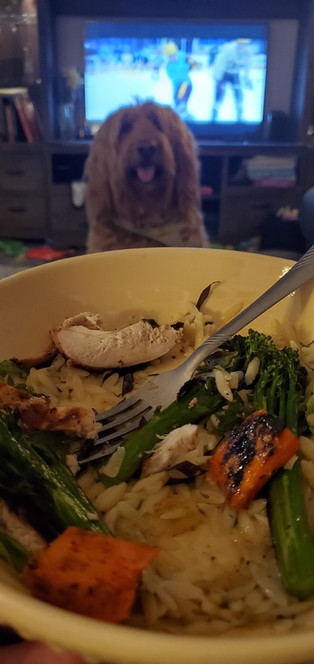 I mean, check out Cudi my large sized golden doodle. He seems pretty excited about the grilled chicken, charred carrots, and creamy risotto topped with garden fresh herbs. Just sayin'. :)